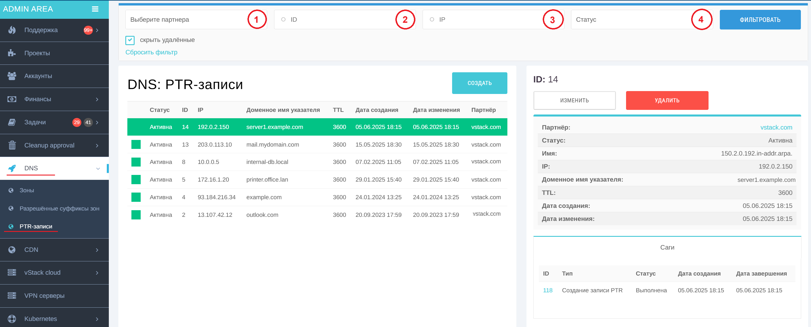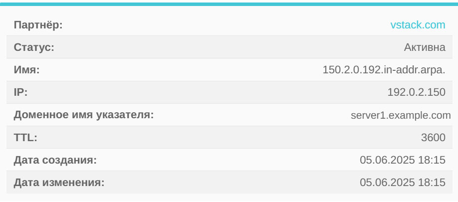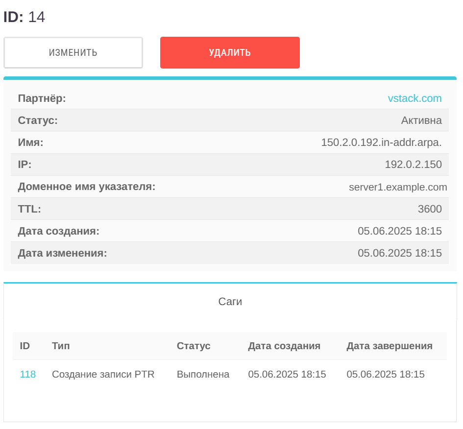 В центральной части карточки содержится информация о партнёре, статус PTR-записи, имя PTR-записи, IP-адрес, доменное имя указателя, значение TTL, даты создания и изменения.