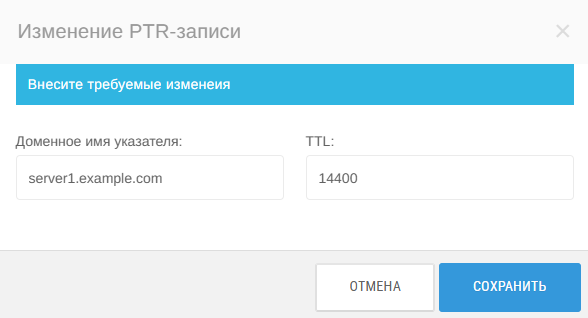 Для изменения PTR-записи нажмите Изменить. В открывшемся можно поменять доменное имя указателя и значение TTL. После внесения изменений нажмите Сохранить.