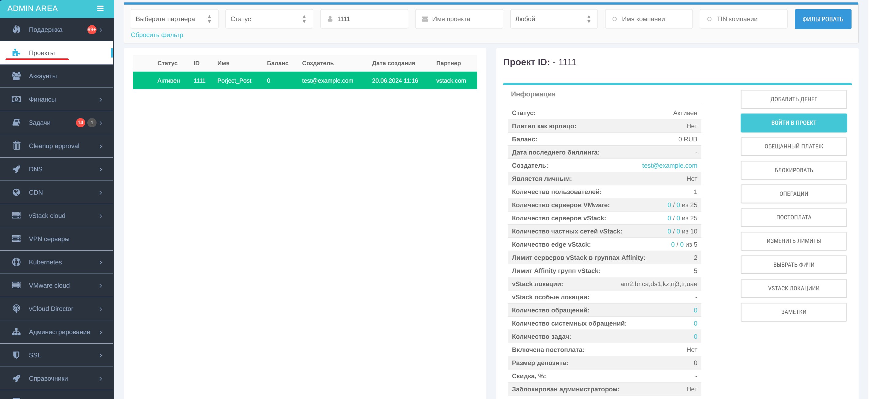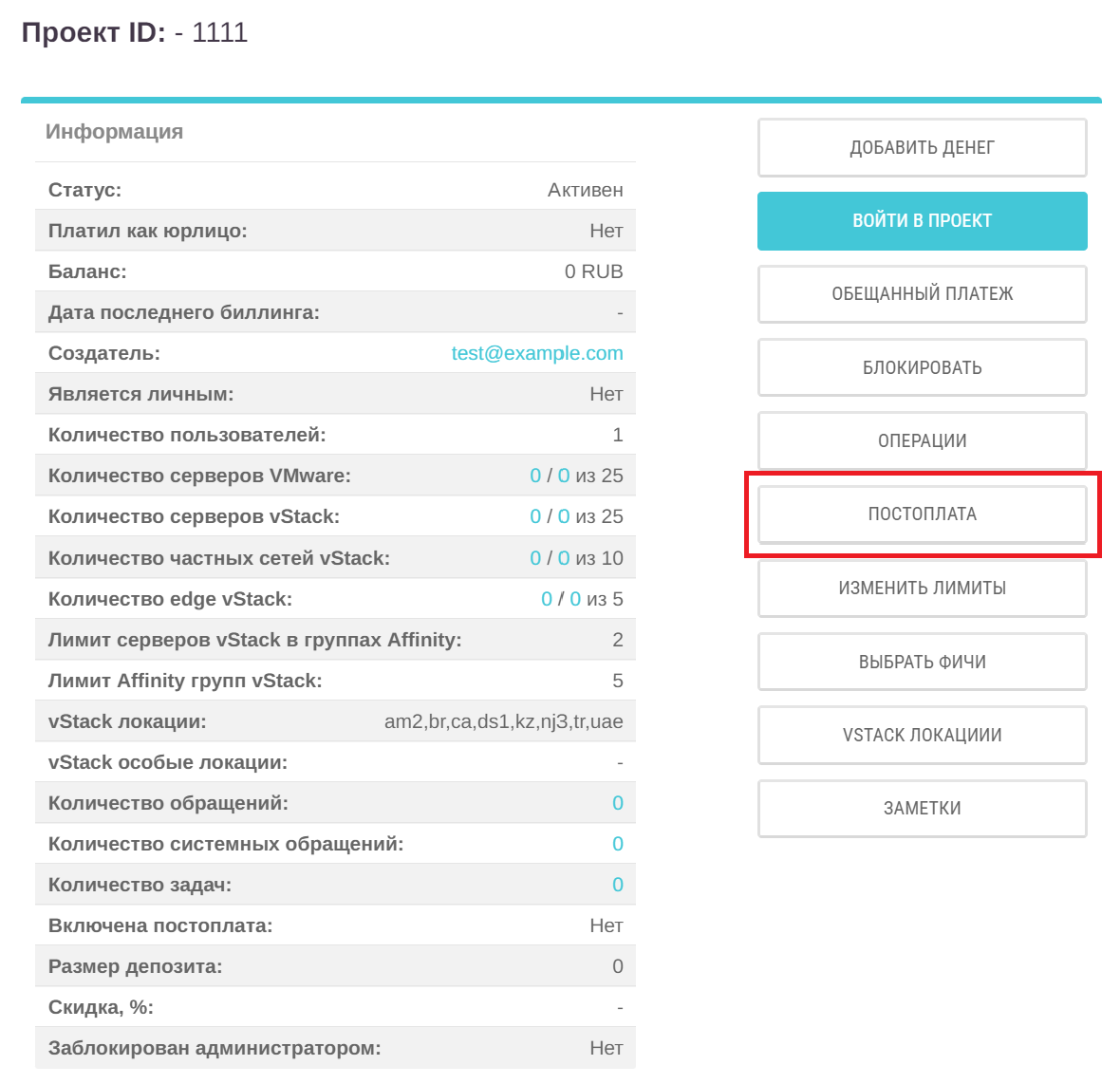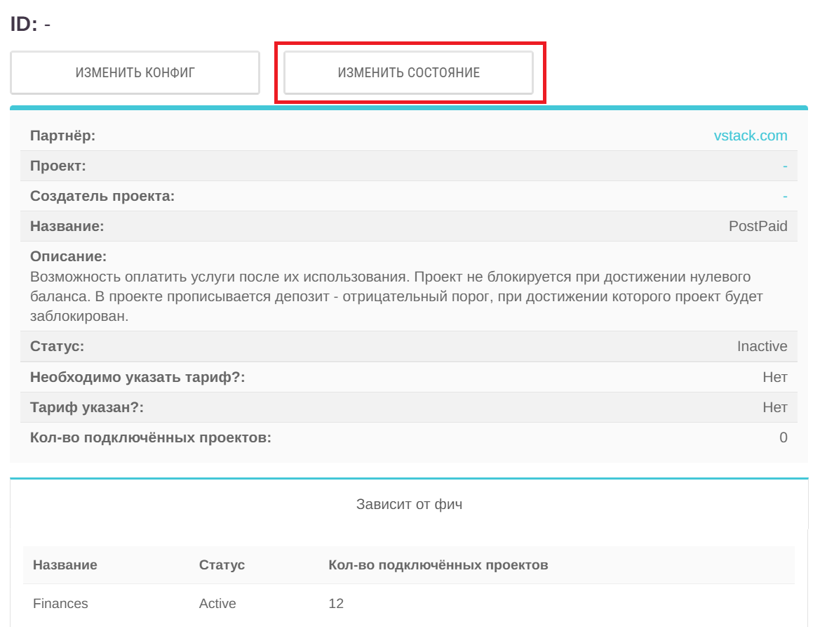Для того чтобы опция постоплаты стала доступна для проектов, её нужно включить на уровне партнёра.