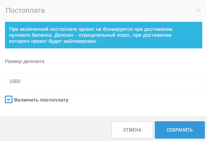2. Далее на карточке проекта нажмите кнопку Постоплата. Выберите размер депозита (отрицательный порог, при достижении которого проект будет заблокирован) и нажмите на галочку Включить постоплату. Кликните Сохранить.