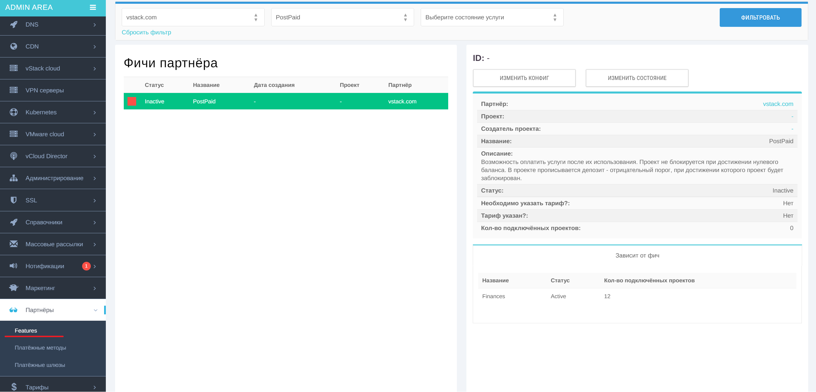 1. В административной панели перейдите в раздел Features вкладки Партнёры. В фильтре выберите услугу Postpaid. В открывшемся списке выберите партнёра.