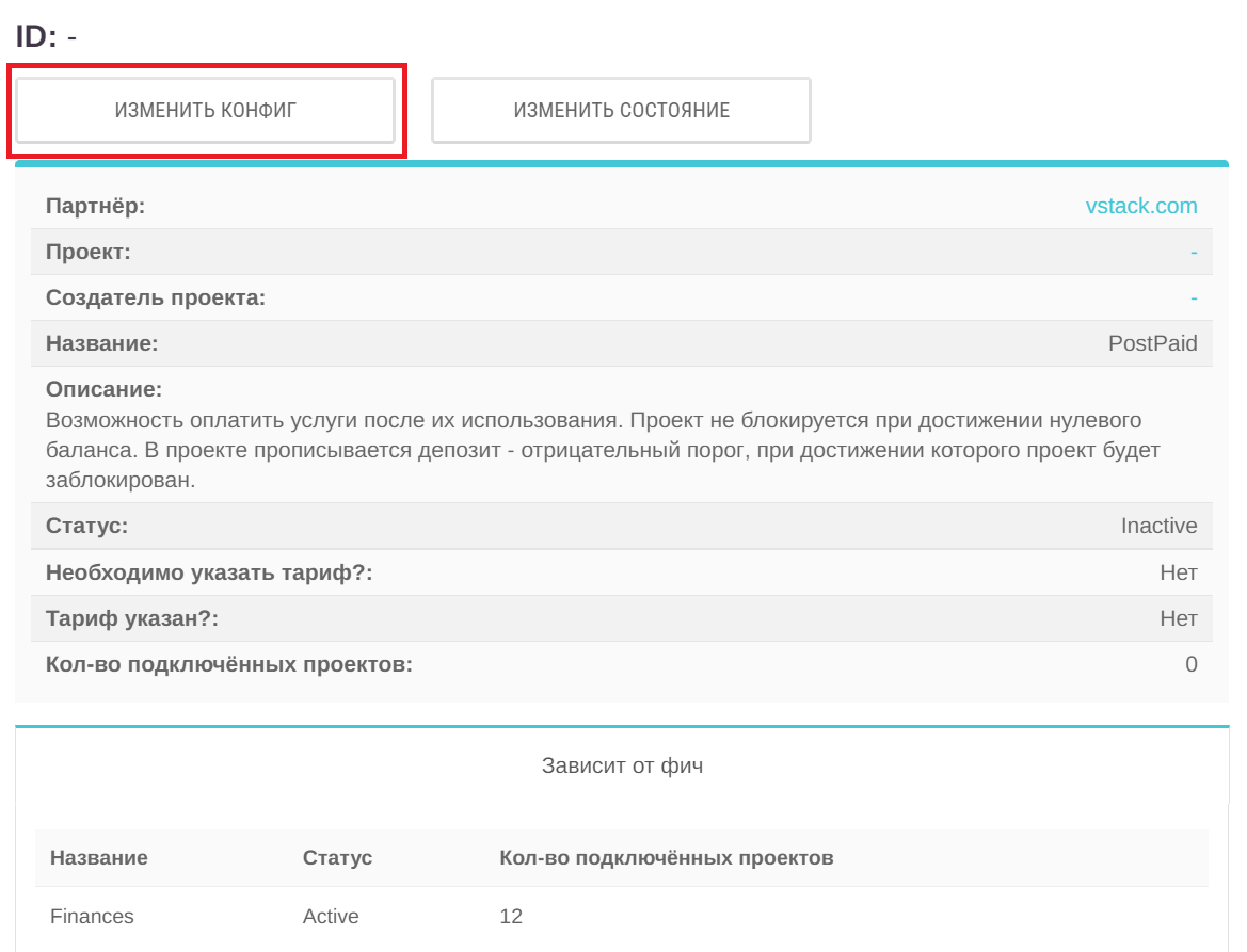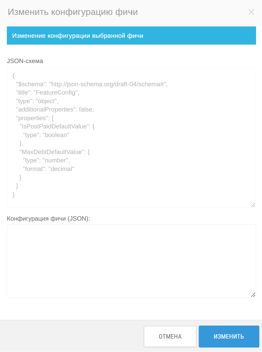 3. В открывшемся окне измените конфигурацию фичи. По примеру представленной JSON схемы заполните параметы IsPostPaidDefaultValue (при значении True постоплата включается по умолчанию для всех проектов партнёра, при значении False постоплата включается отдельно) и MaxDebtDefaultValue (сумма отрицательного порога по умолчанию, при достижении которого проект будет заблокирован). Нажмите Изменить.