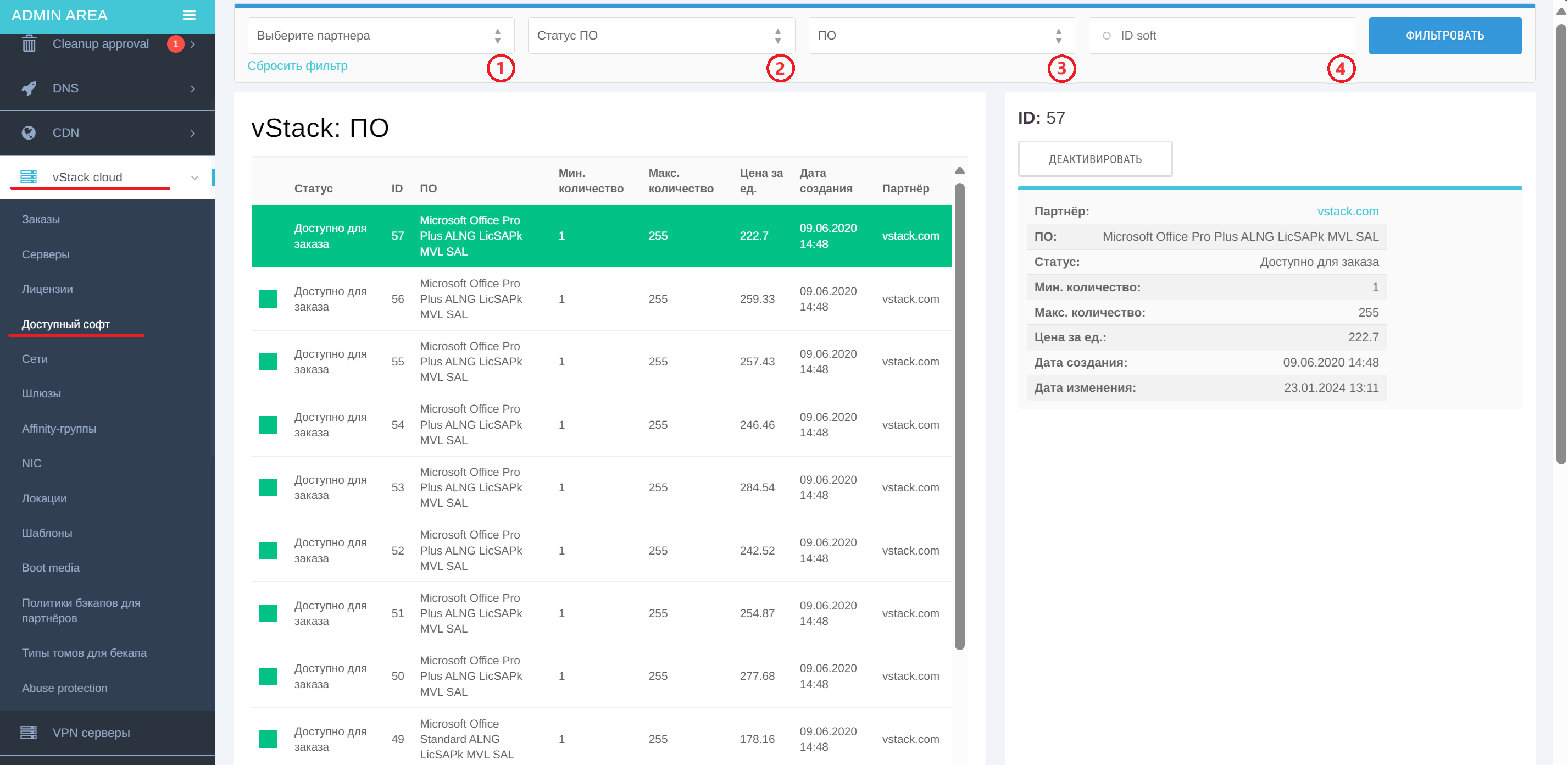 В разделе Доступный софт вкладки vStack Cloud отображается список лицензий ПО, которые пользователь панели может подключить к ВМ.