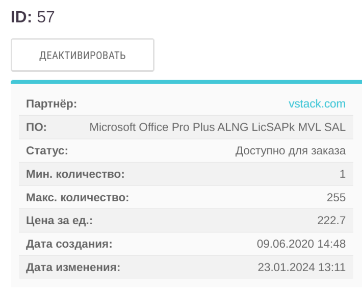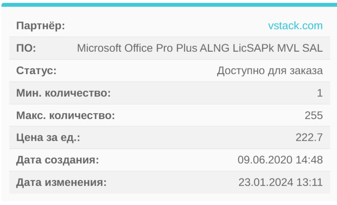 В центральной части карточки содержится информация о партнёре, наименование ПО, его статус, минимальное и максимальное количество, цена за единицу в валюте партнёра, дата создания и изменения.