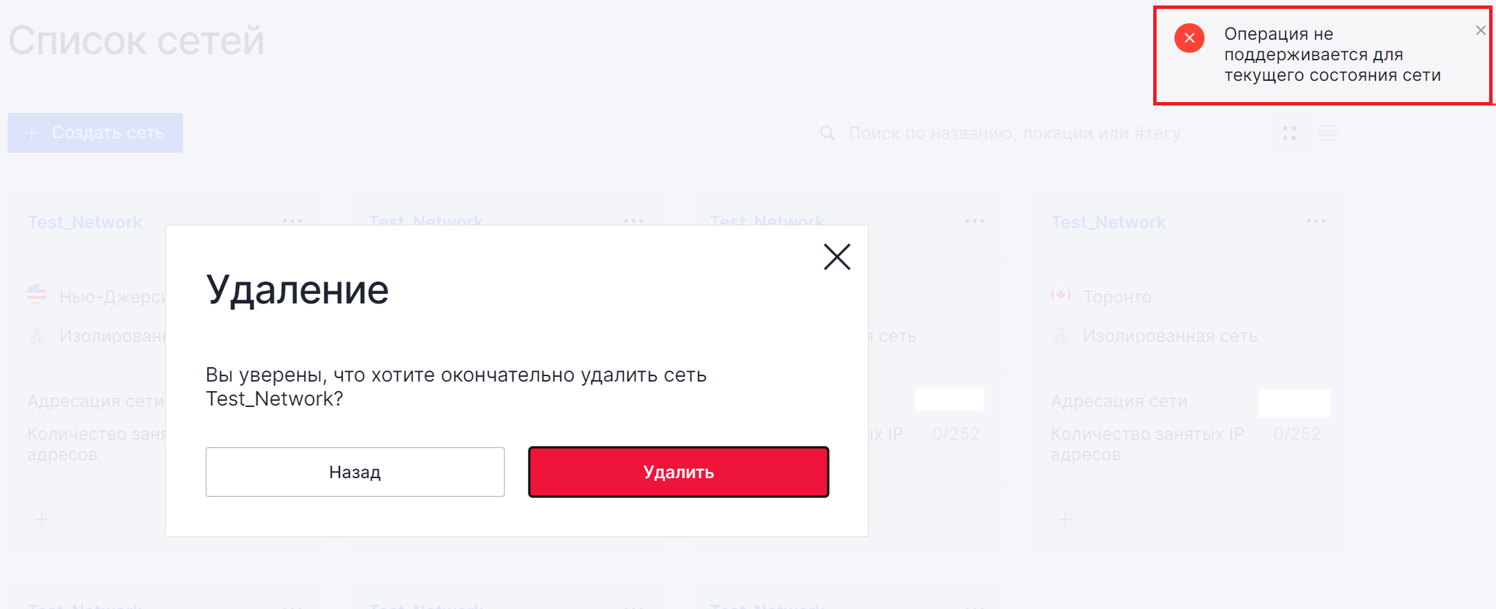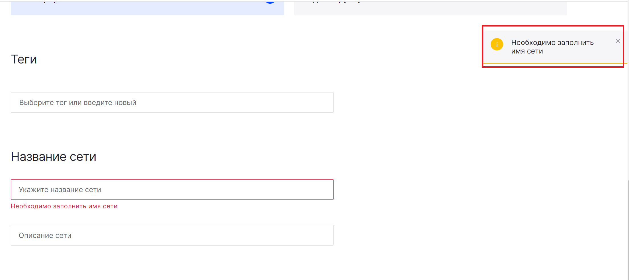 Уведомления желтого цвета чаще всего указывают на необходимость заполнить какие-либо поля, например, название сети при ее создании.
