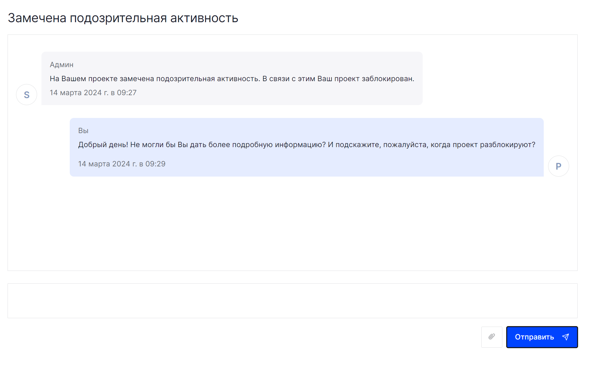 Уведомления от техподдержки могут быть трех типов: жалоба, информация и подозрительная активность.