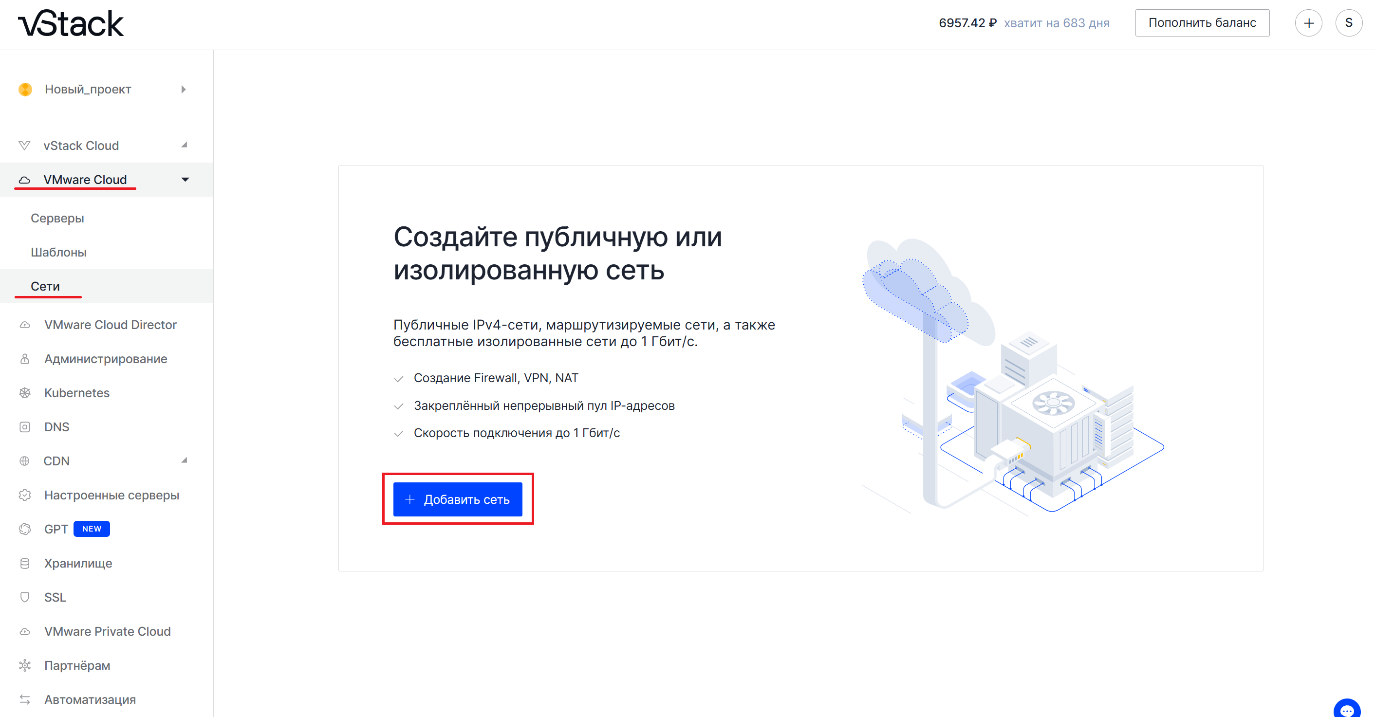 Для создания сети перейдите в раздел Сети вкладки VMware Cloud и нажмите +Добавить сеть.