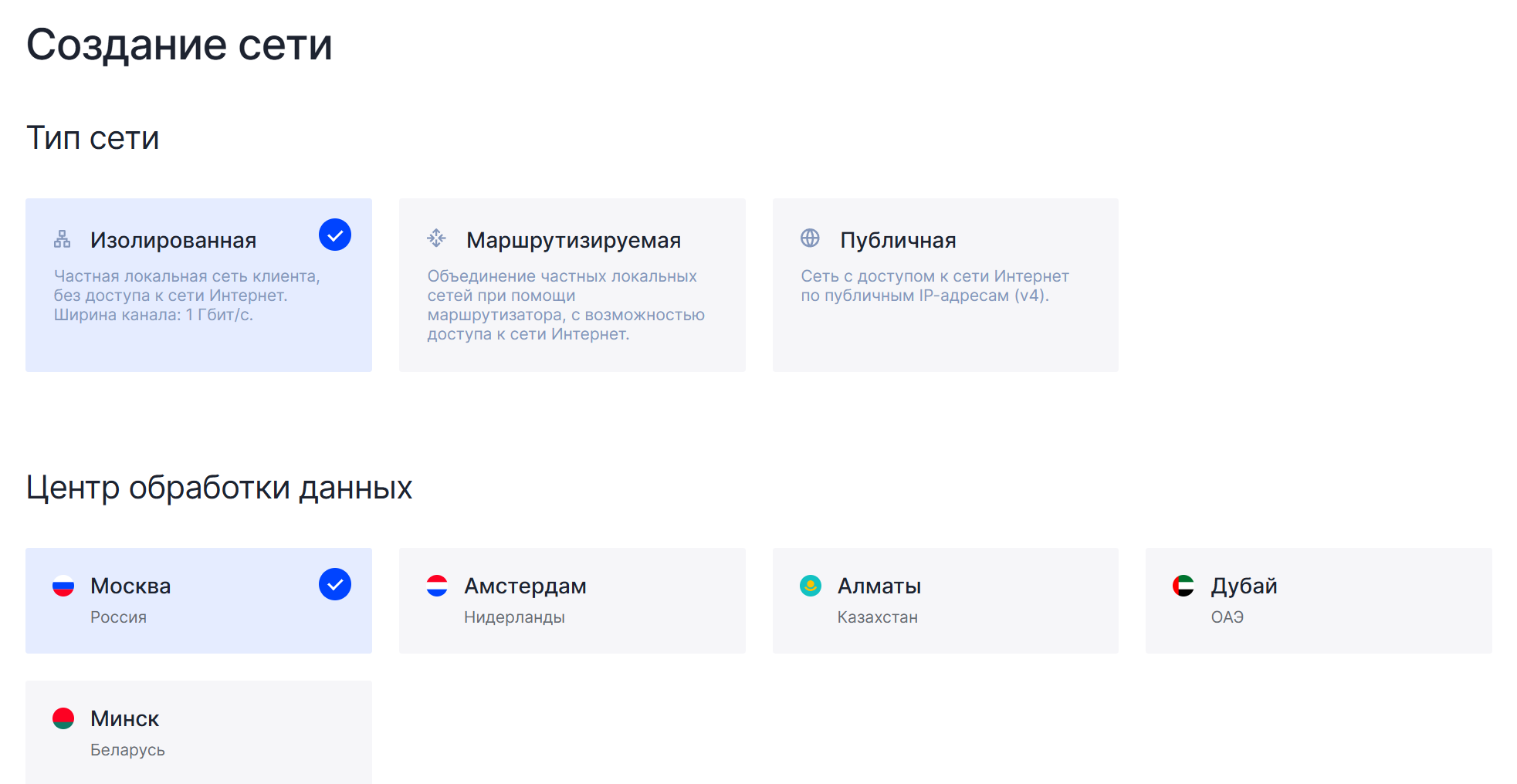 В инфраструктуре VMware Cloud доступно создание трёх видов сетей: изолированной, маршрутизируемой или публичной.