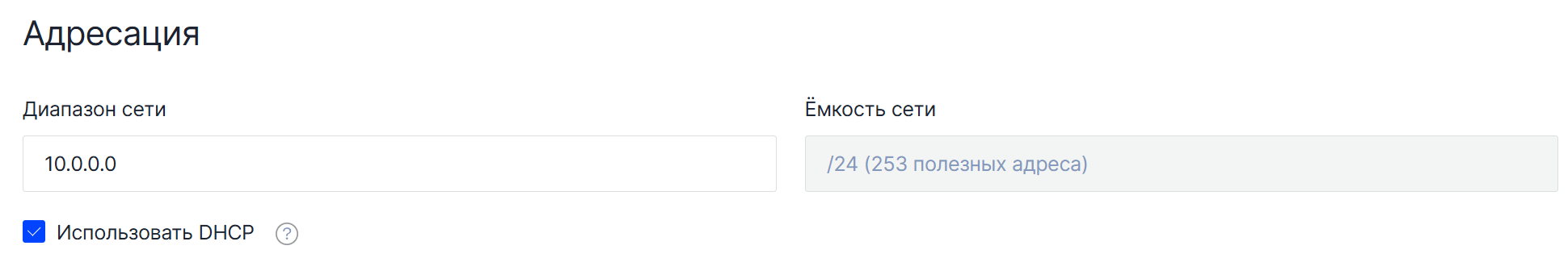 Заполните поле с диапазоном сети. При необходимости активируйте опцию использовать DHCP, чтобы IP-адреса назначались виртуальным машинам динамически. При перезагрузке ВМ IP-адреса переназначаются.