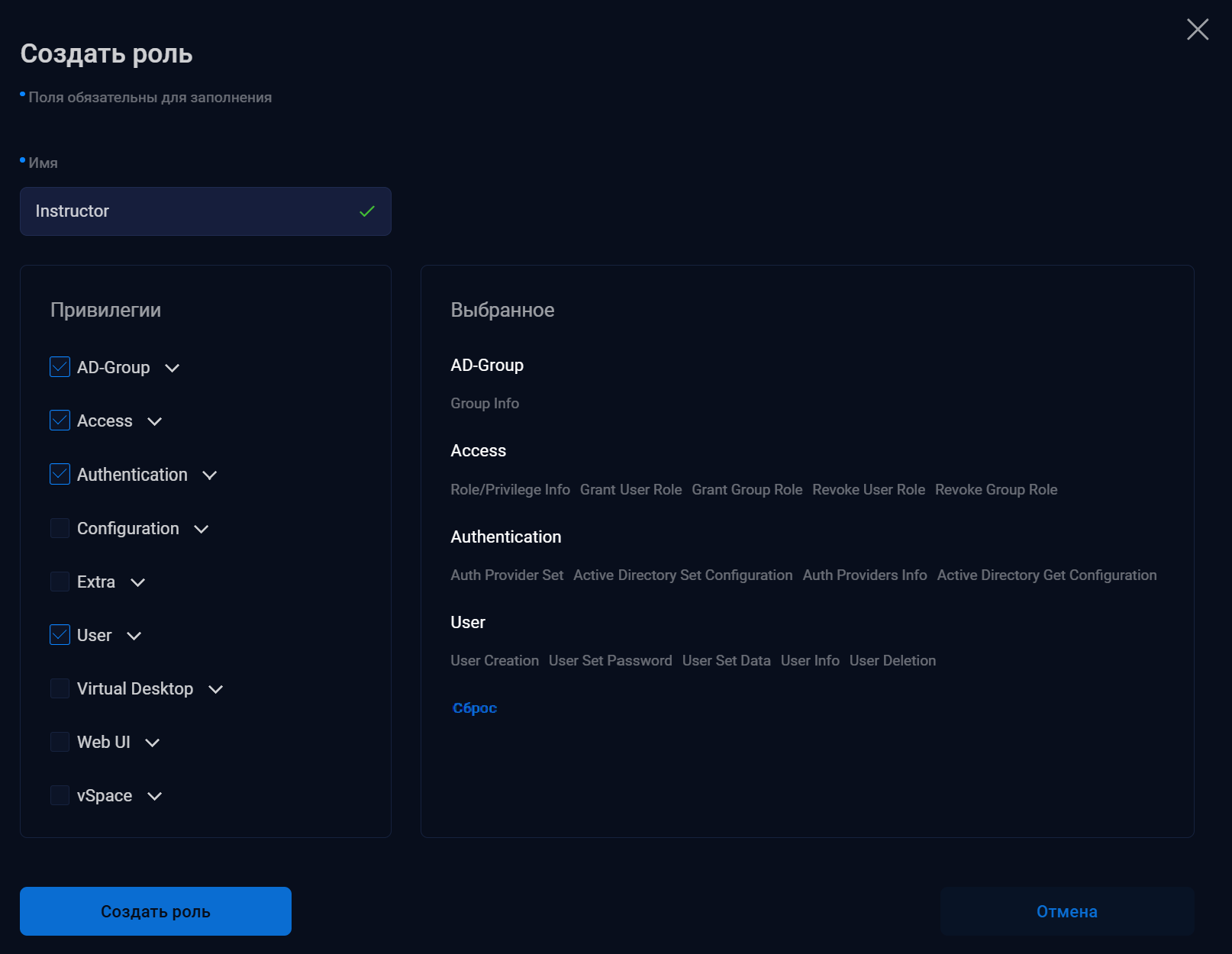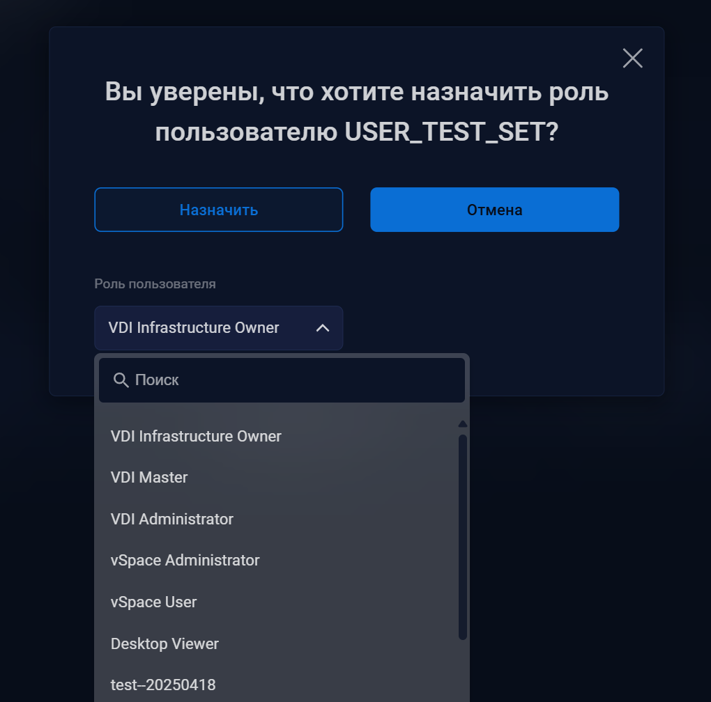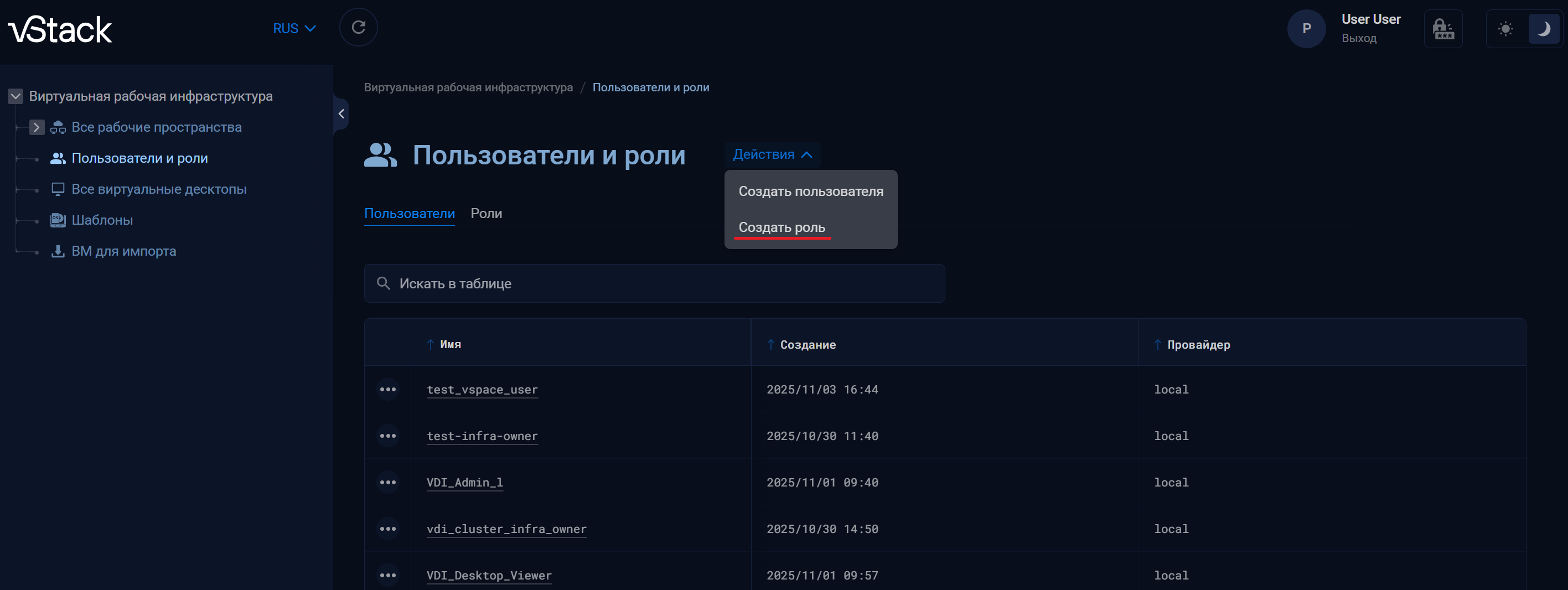 В vStack VDI есть возможность создавать и модифицировать пользовательские роли, а также назначать роли пользователям. Создание ролей возможно как глобально для всей инфраструктуры VDI, так и для определённых рабочих пространств и рабочих столов.