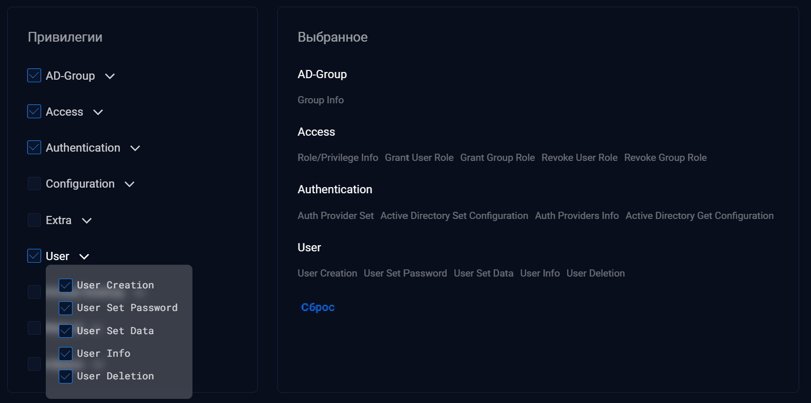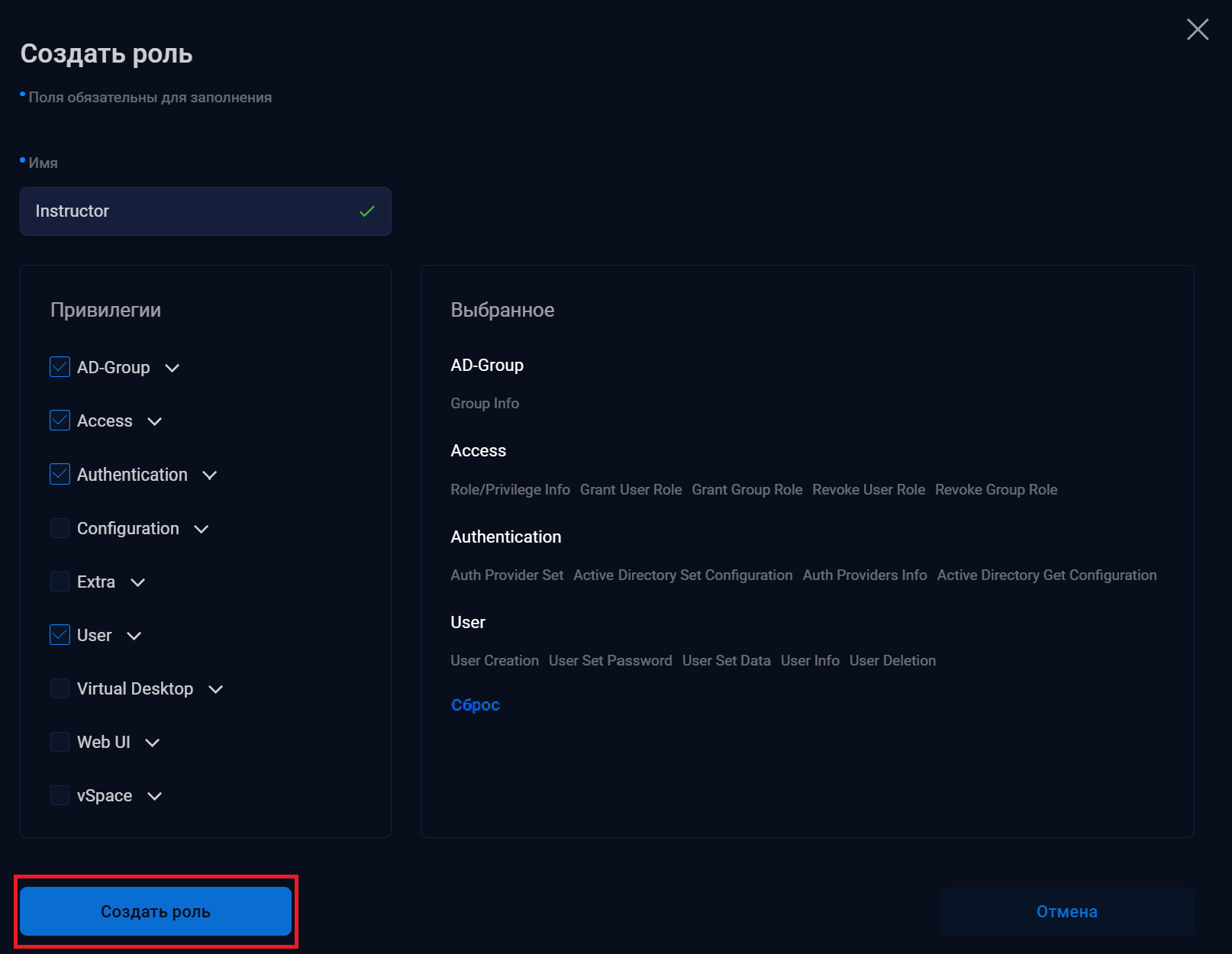Далее выберите привилегии, которые будут присвоены новой роли.
