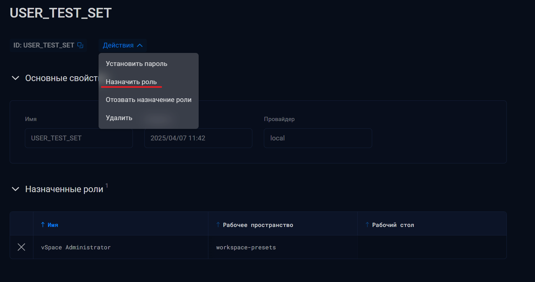 В профиле пользователя нажмите Действия и выберите Назначить роль.