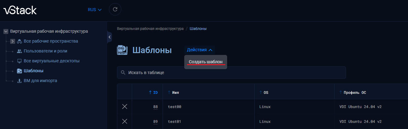 Для создания шаблона перейдите на вкладку Шаблоны, нажмите Действия и вбыерите Создать шаблон.