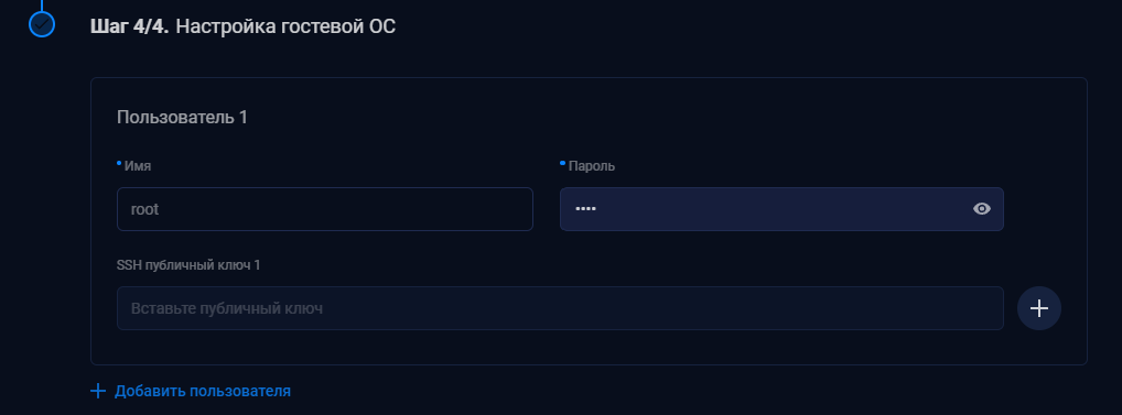 Далее заполните данные суперпользователя (Пароль и публичный ключ SSH) и при необходимости добавьте других пользователей с помощью кнопки + Добавить пользователя.